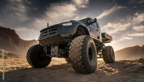 © Simon, Fototapeta premium Futuristic cyberpunk heavy duty offroad car in desert with big wheels