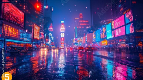 © GioGio, Naklejka premium Futuristic Cyberpunk-Inspired Night Cityscape with Neon Lights and Holographic Advertisements Glowing Brightly, Captured with a Wide-Angle Lens and Cool Color Palette Evoking Mystery and Intrigue