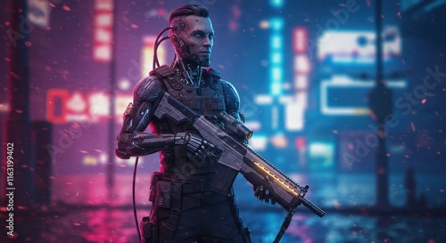 Fototapeta premium Futuristic cyberpunk soldier in neon cityscape at night with advanced armor and weapon