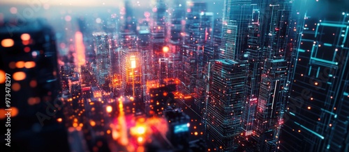 Fototapeta premium Futuristic cyberpunk style illustration featuring an abstract modern cityscape with a glitch effect 3D rendering showcasing cyberspace design and elements of AI and deep learning