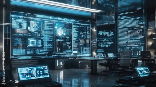 Obraz premium Futuristic Cybersecurity Office Control Room Displays Data