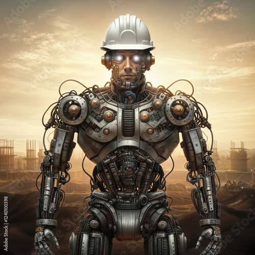 © ASPmedia, Fototapeta premium futuristic cyborg builder with mechanical parts inside body at construction site . Generative AI