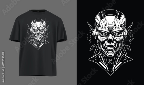 © Mukhliez, Fototapeta premium Futuristic Cyborg Face Vector – White Minimal Techwear Design on Black