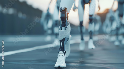 Fototapeta premium Futuristic cyborg sports league, athletes equipped with robotic limbs and high-performance prosthetics, competing at various technology levels, driving innovation in bioengineering and sports