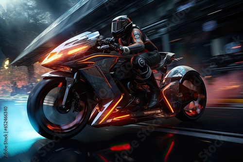 Obraz premium Futuristic cyclist flies on track surrounded by holograms and adrenaline., generative IA