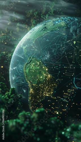 © decorator, Fototapeta premium Futuristic 3d earth model in fog illuminating connections between agriculture and emissions