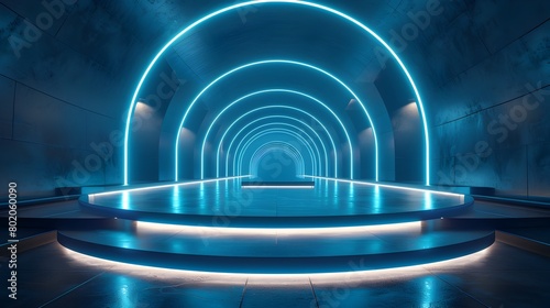 Naklejka premium Futuristic Dark Podium and Luminous Corridor with Reflective Geometric Backdrop