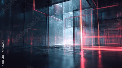 © PikePicture, Fototapeta premium Futuristic dark room with glowing red neon frames