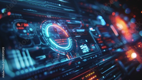 Fototapeta premium Futuristic dashboard interface with data visualizations and performance indicators, showing advanced tech capabilities in a digital environment