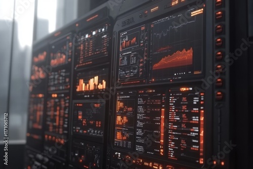 Obraz premium Futuristic Data Center Control Panel with Orange Glowing Interfaces