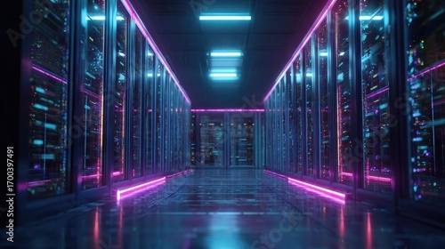 © Chen, Fototapeta premium Futuristic data center corridor with glowing neon lights and rows of server racks, abstract technology background symbolizing cloud, network and security