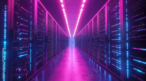 Fototapeta premium Futuristic data center interior with glowing blue and pink lights reflecting...