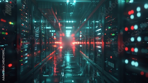 Obraz premium Futuristic data center server racks - High-tech data center with glowing server racks conveys advanced computing and information storage