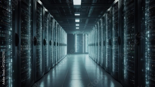 © melisasaputri, Fototapeta premium Futuristic Data Center Server Room with Rows of Rack Servers.