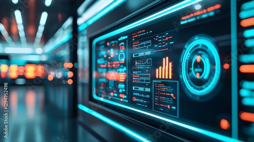 Obraz premium Futuristic Data Center with Glowing Screens: High Tech Interface and AI...
