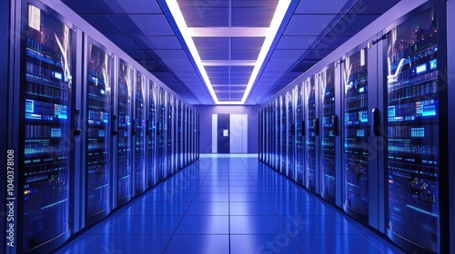 Fototapeta premium Futuristic data center with high-tech server racks illuminated by blue lighting