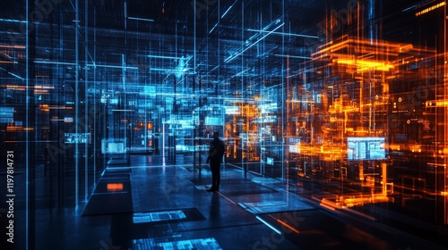 © Monchisa, Obraz premium Futuristic Data Center with Neon Lights and Digital Visualization