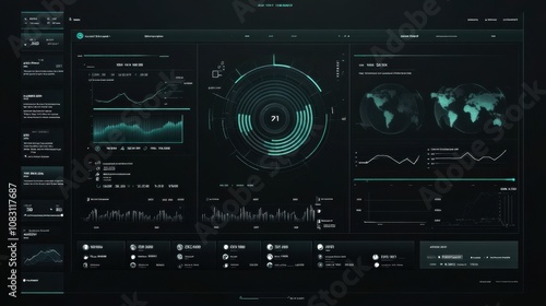 Obraz premium Futuristic Data Dashboard Interface Displaying Real-Time Analytics Metrics and Visualizations on a Dark Background in a High-Tech Environment