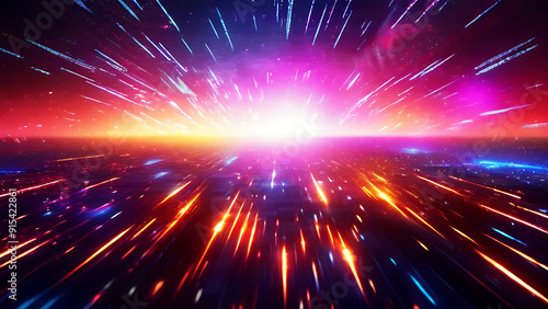 Naklejka premium Futuristic Data Flow Explosion Effect with Sci-Fi Motion and Neon Glowing Rays for High-Tech Background and Hyper-Realistic Design.
