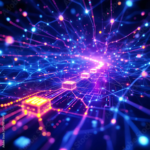 Fototapeta premium Futuristic data network and glowing circuitry concept in vibrant neon colors...
