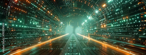 Obraz premium Futuristic data node with illuminated lines and circuits in a high-tech environment.
