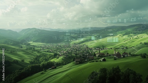 © Johannes, Fototapeta premium Futuristic Data Overlay on Rolling Green Hills and Village