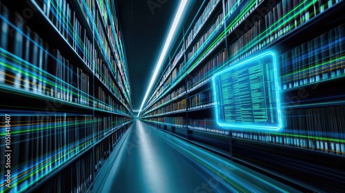 © Thamonchanok, Naklejka premium Futuristic data storage library with glowing elements and shelves, digital concept.