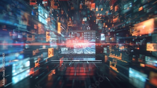 © alphaspirit, Obraz premium Futuristic data user interface displayed on a laptop in a dark cyberspace environment with streaking data movement