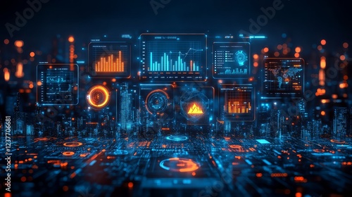 © Atchariya63, Obraz premium Futuristic data visualization with glowing graphs and figures in a digital landscape.