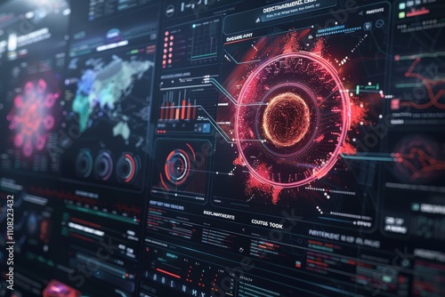 © darion, Obraz premium Futuristic data visualization with graphs and maps for analysis.