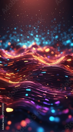 © Nailotl, Obraz premium Futuristic data visualization with vibrant moving sound waves and glowing dots. Dynamic background.
