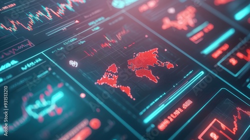 Obraz premium Futuristic data visualization with world map and financial charts in neon colors, showcasing global analytics and market trends.