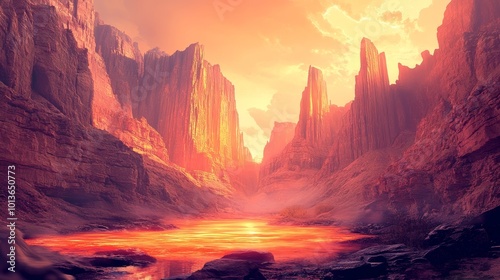 Fototapeta premium Futuristic Desert Canyon Oasis, towering rock formations, holographic water, warm tones, intricate digital art, vibrant sci-fi landscape