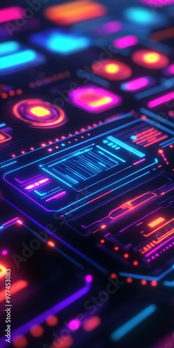 Obraz premium Futuristic design review tool, glowing UI elements, holographic usability recommendations, digital interface audit