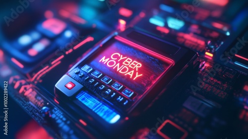 Fototapeta premium Futuristic Device Displaying "Cyber Monday" in Neon Lights