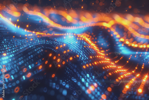 © PHAISITSAWAN, Obraz premium Futuristic digital abstraction Neon lights streaming data Binary code Blue and orange high tech.
