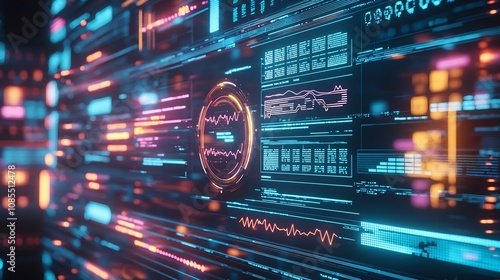 © Wuttichai, Obraz premium Futuristic Digital Analytics Interface Visualizing Social Media Sentiment Data Streams