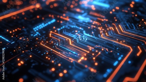 © Fatimah, Fototapeta premium Futuristic Digital Circuit Board with Blue and Orange Light Effects