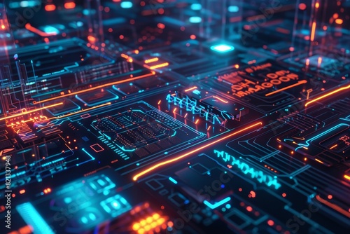 Fototapeta premium Futuristic digital circuit board with glowing blue and orange lights, representing advanced technology and data processing.