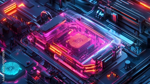 Fototapeta premium Futuristic Digital Circuit Board with Neon Lights and Microchip Design,...
