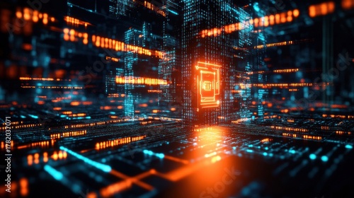 Fototapeta premium Futuristic digital circuit environment with glowing orange and blue code...