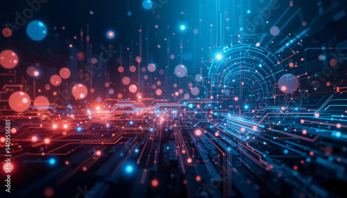Fototapeta premium Futuristic digital circuit with glowing data nodes and abstract HUD