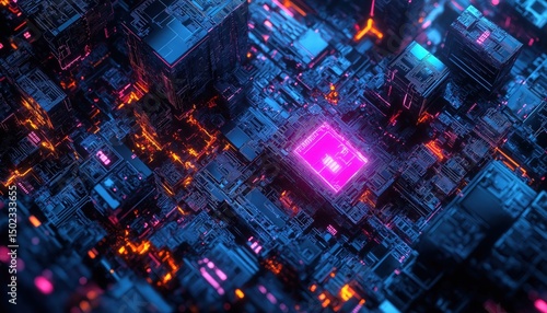 © GOLVR, Fototapeta premium Futuristic Digital City Circuit Board with Neon Lights and Technology