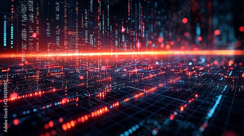 © NailulMuna, Fototapeta premium Futuristic digital city glowing at night; data streams, network visualization; tech background
