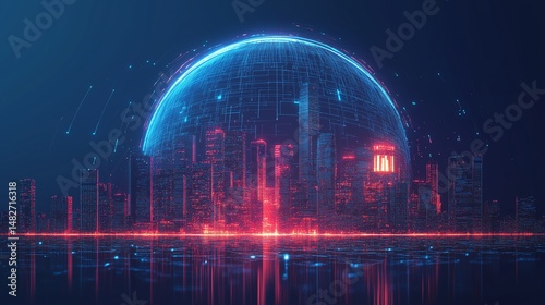 © TimeShops, Fototapeta premium Futuristic Digital City Under Cyber Security Dome, Holographic Cityscape in Vector Illustration with Copy Space