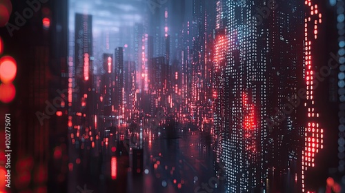© kwanchaift, Fototapeta premium Futuristic digital cityscape at night adorned with binary code, illustrating the integration of technology and urban life. A vision for tomorrows cities.