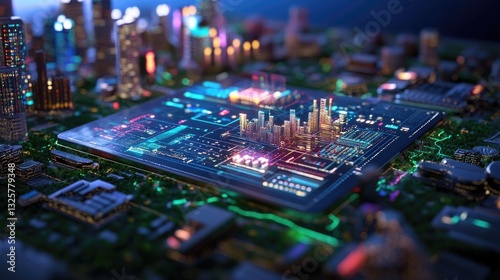 © ALIS ST, Obraz premium Futuristic Digital Cityscape with Circuit Board and Colorful Lights