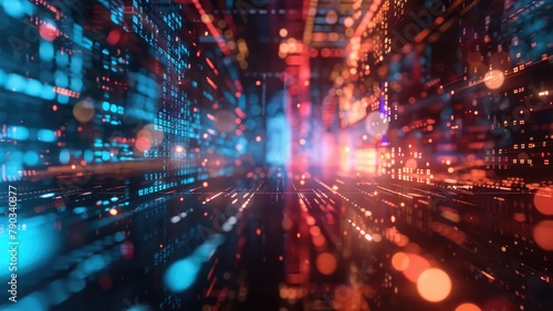 © Tati, Fototapeta premium Futuristic digital cityscape with glowing neon lights and abstract data structures