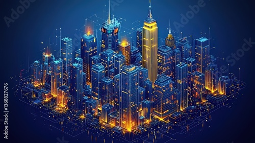 Fototapeta premium Futuristic digital cityscape with glowing skyscrapers and neon network lines