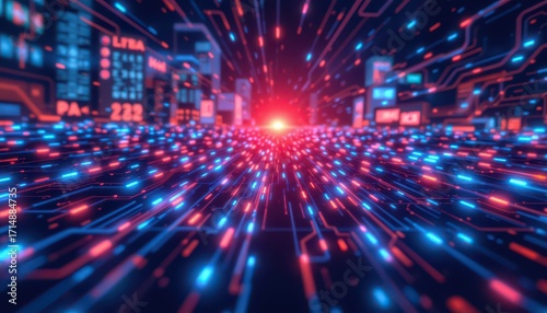© Danudet.C, Fototapeta premium Futuristic Digital Cityscape with Vibrant Lights and Data Displays